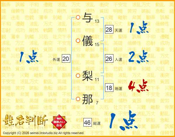 与儀梨那さんの人運は26画の2点!