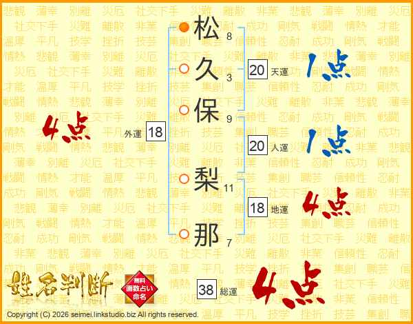 松(8画)久(3画)保(9画) 梨(11画)那(7画)