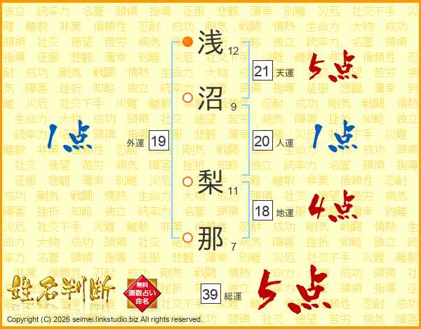 浅沼梨那さんの総運は39画の5点!