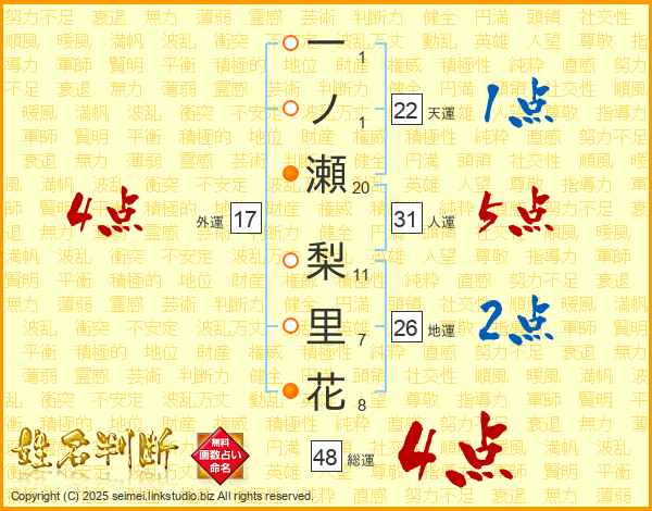 一(1画)ノ(1画)瀬(20画) 梨(11画)里(7画)花(8画)