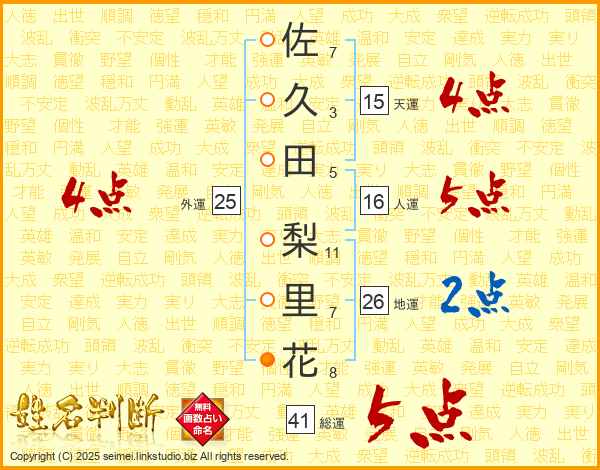 佐(7画)久(3画)田(5画) 梨(11画)里(7画)花(8画)