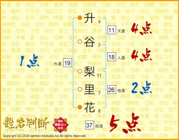 生活面を象徴する運勢です。外部から受ける影響力を表し、結婚運、家庭運や職場、環境への順応性を表します。総運から人運を引いた画数。姓や名が1文字の場合を除く。