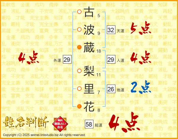 古(5画)波(9画)蔵(18画) 梨(11画)里(7画)花(8画)
