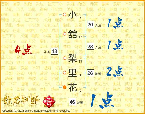 小(3画)舘(17画) 梨(11画)里(7画)花(8画)