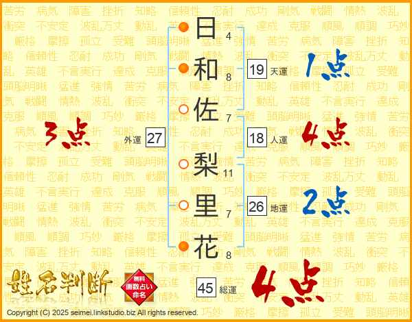日(4画)和(8画)佐(7画) 梨(11画)里(7画)花(8画)