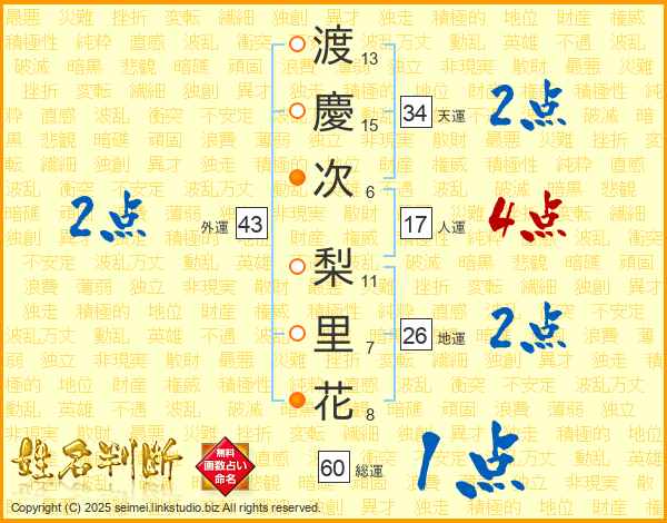 渡(13画)慶(15画)次(6画) 梨(11画)里(7画)花(8画)