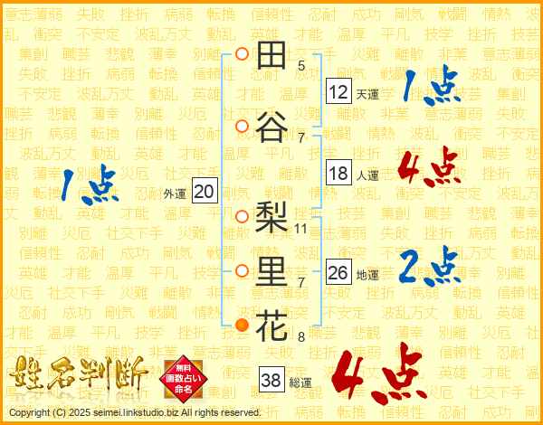 田(5画)谷(7画) 梨(11画)里(7画)花(8画)
