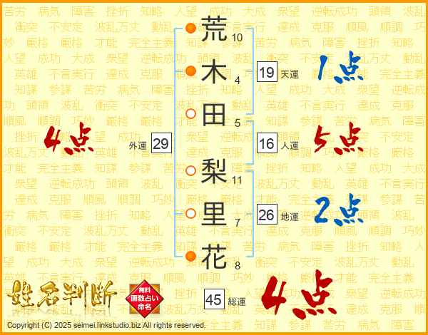 荒(10画)木(4画)田(5画) 梨(11画)里(7画)花(8画)