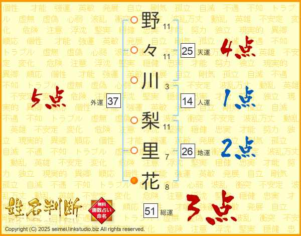 野(11画)々(11画)川(3画) 梨(11画)里(7画)花(8画)