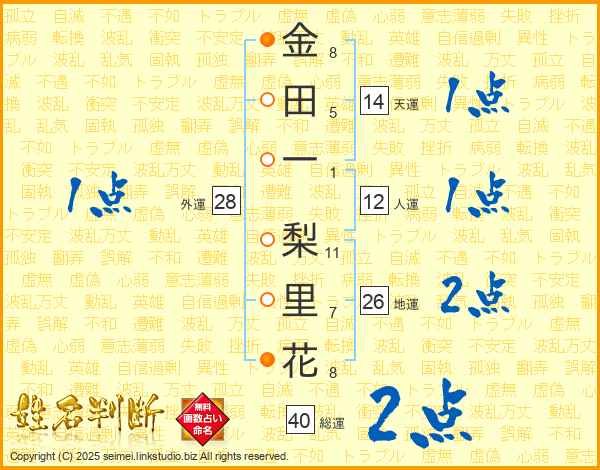 金(8画)田(5画)一(1画) 梨(11画)里(7画)花(8画)