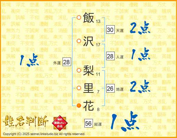 飯(13画)沢(17画) 梨(11画)里(7画)花(8画)