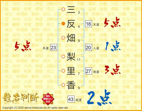 三(3画)反(4画)畑(9画) 梨(11画)里(7画)香(9画)
