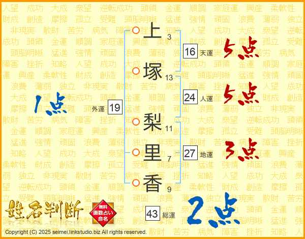 上(3画)塚(13画) 梨(11画)里(7画)香(9画)