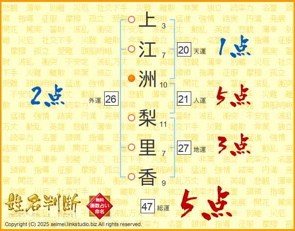 上(3画)江(7画)洲(10画) 梨(11画)里(7画)香(9画)