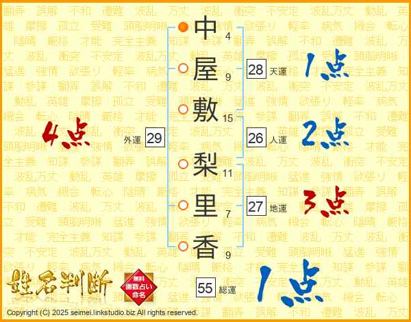 中(4画)屋(9画)敷(15画) 梨(11画)里(7画)香(9画)