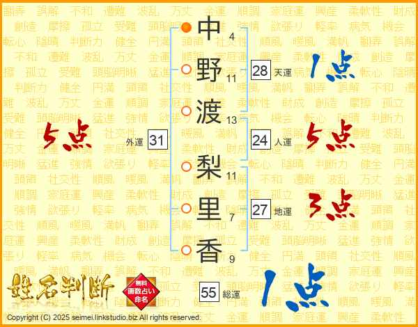中(4画)野(11画)渡(13画) 梨(11画)里(7画)香(9画)