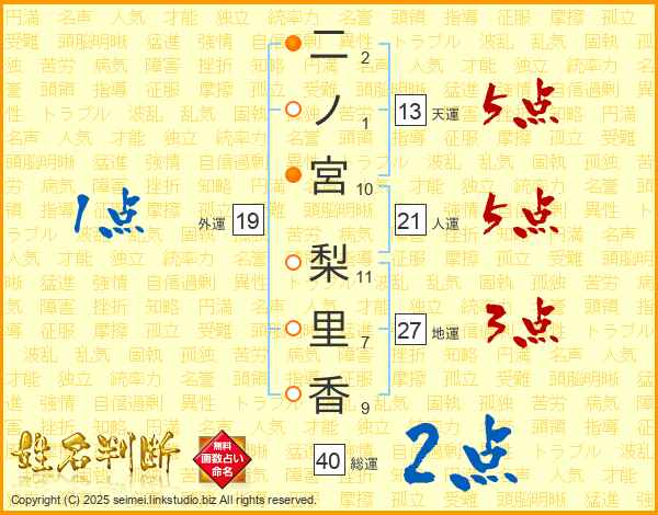 二(2画)ノ(1画)宮(10画) 梨(11画)里(7画)香(9画)