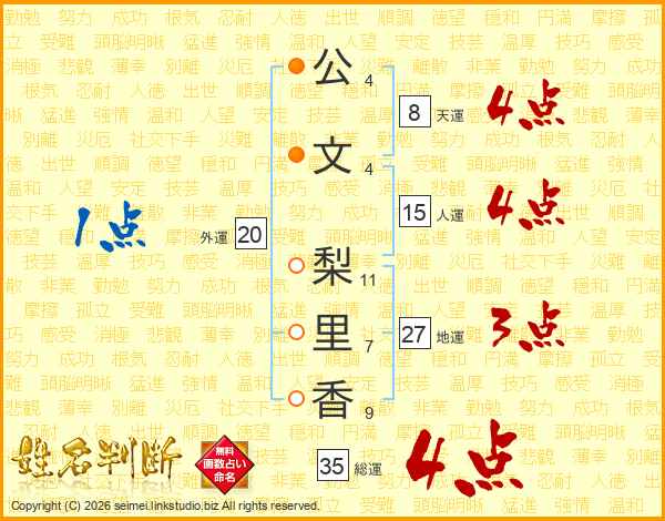 公(4画)文(4画) 梨(11画)里(7画)香(9画)