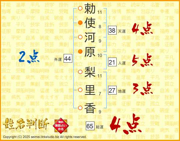勅(11画)使(8画)河(9画)原(10画) 梨(11画)里(7画)香(9画)
