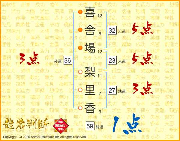 喜(12画)舎(8画)場(12画) 梨(11画)里(7画)香(9画)