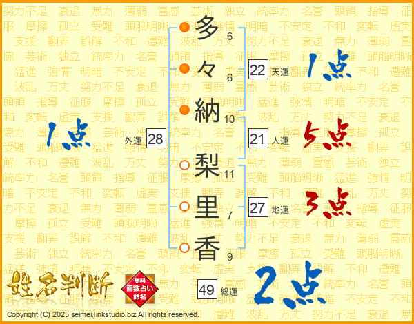 多(6画)々(6画)納(10画) 梨(11画)里(7画)香(9画)