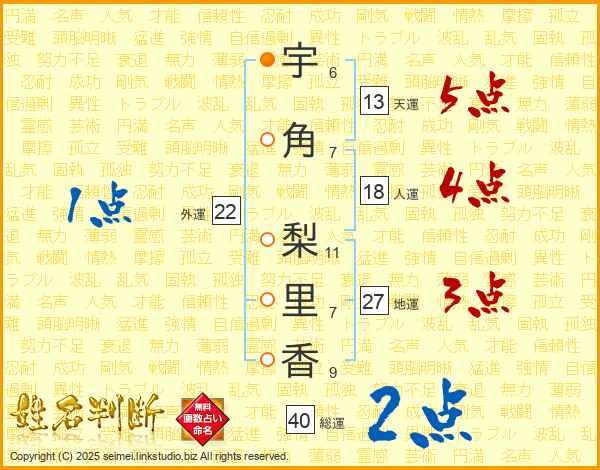 宇(6画)角(7画) 梨(11画)里(7画)香(9画)