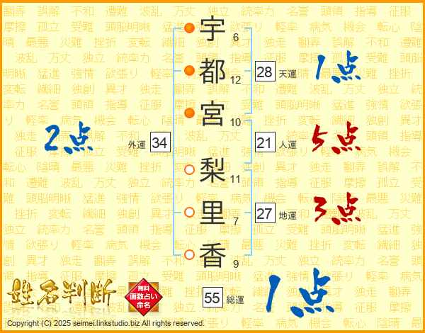 宇(6画)都(12画)宮(10画) 梨(11画)里(7画)香(9画)
