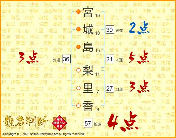 宮(10画)城(10画)島(10画) 梨(11画)里(7画)香(9画)