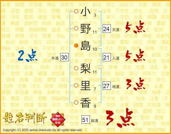 小(3画)野(11画)島(10画) 梨(11画)里(7画)香(9画)