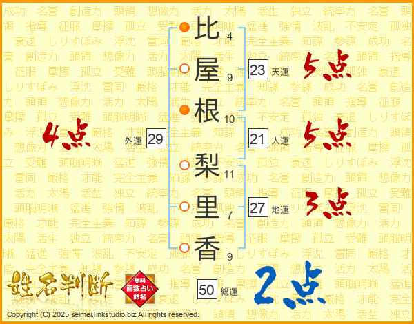 比(4画)屋(9画)根(10画) 梨(11画)里(7画)香(9画)