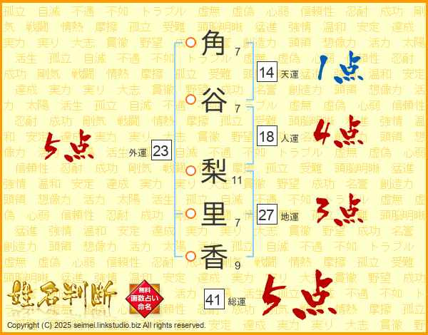 角(7画)谷(7画) 梨(11画)里(7画)香(9画)