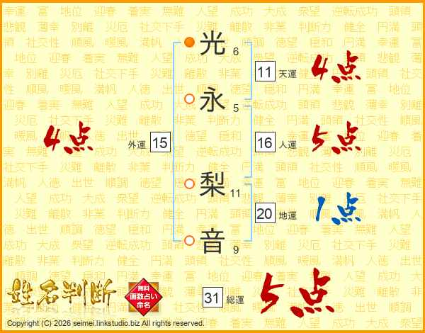 あなたの人生を表す1番重要な運勢です。生涯を通じて影響する総合運となり、主に50歳以降の晩年期に影響を及ぼします。苗字と名前の合計画数。