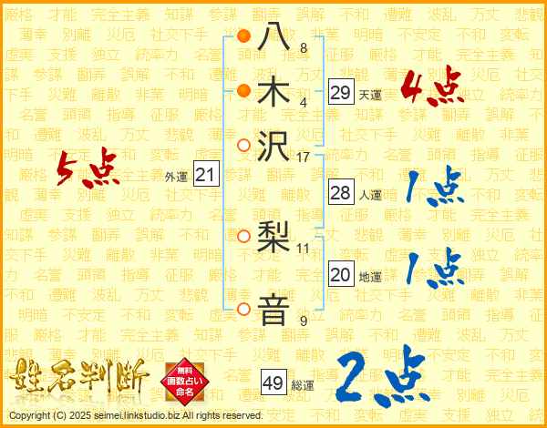 八(8画)木(4画)沢(17画) 梨(11画)音(9画)