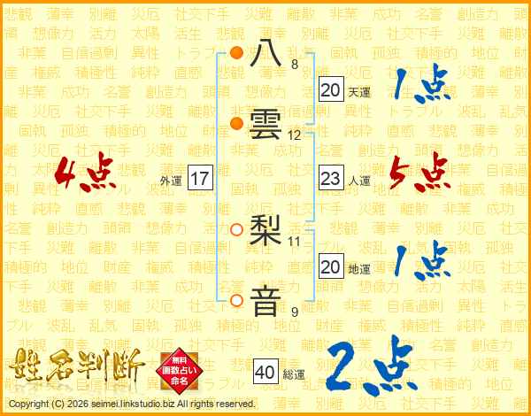 生活面を象徴する運勢です。外部から受ける影響力を表し、結婚運、家庭運や職場、環境への順応性を表します。総運から人運を引いた画数。姓や名が1文字の場合を除く。