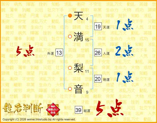 生活面を象徴する運勢です。外部から受ける影響力を表し、結婚運、家庭運や職場、環境への順応性を表します。総運から人運を引いた画数。姓や名が1文字の場合を除く。