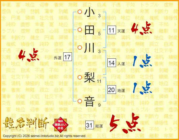 生活面を象徴する運勢です。外部から受ける影響力を表し、結婚運、家庭運や職場、環境への順応性を表します。総運から人運を引いた画数。姓や名が1文字の場合を除く。