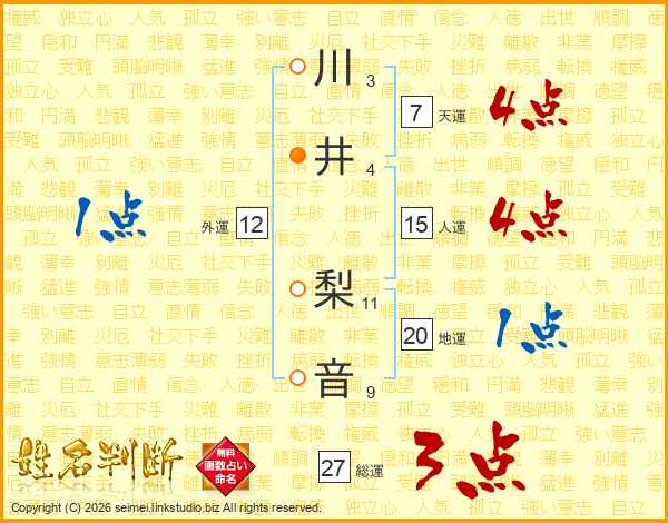 川(3画)井(4画) 梨(11画)音(9画)