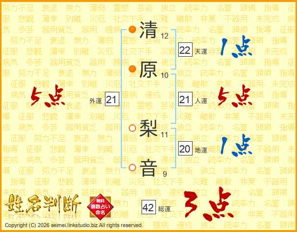 生活面を象徴する運勢です。外部から受ける影響力を表し、結婚運、家庭運や職場、環境への順応性を表します。総運から人運を引いた画数。姓や名が1文字の場合を除く。