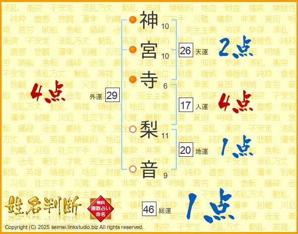 神(10画)宮(10画)寺(6画) 梨(11画)音(9画)
