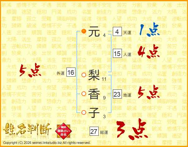 元(4画) 梨(11画)香(9画)子(3画)