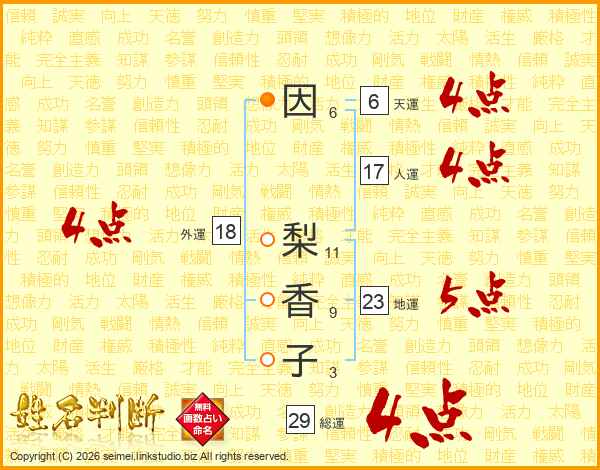 因(6画) 梨(11画)香(9画)子(3画)