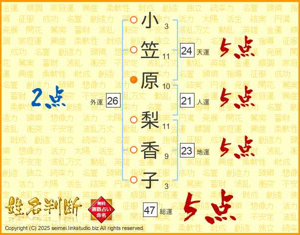 小(3画)笠(11画)原(10画) 梨(11画)香(9画)子(3画)