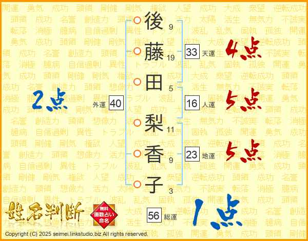 後(9画)藤(19画)田(5画) 梨(11画)香(9画)子(3画)