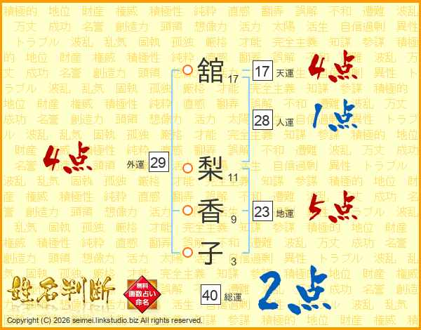 生活面を象徴する運勢です。外部から受ける影響力を表し、結婚運、家庭運や職場、環境への順応性を表します。総運から人運を引いた画数。姓や名が1文字の場合を除く。