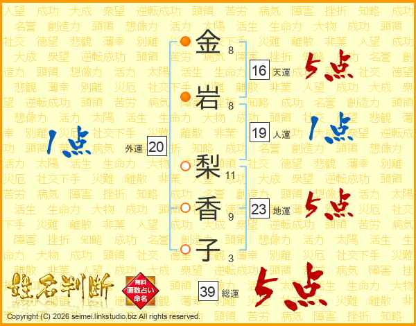 金(8画)岩(8画) 梨(11画)香(9画)子(3画)