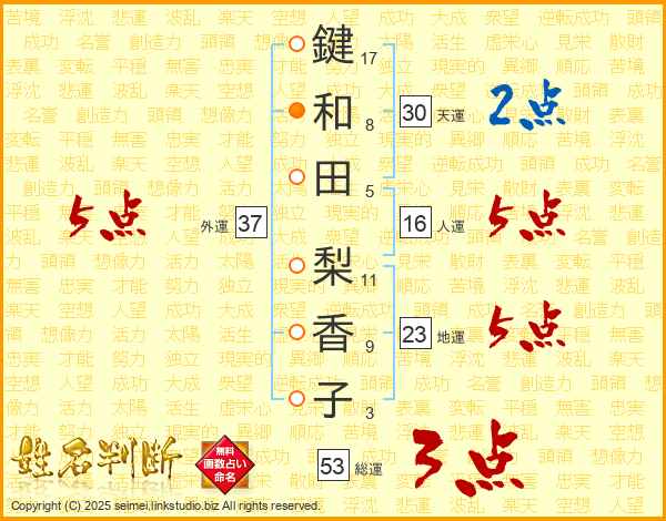 鍵(17画)和(8画)田(5画) 梨(11画)香(9画)子(3画)