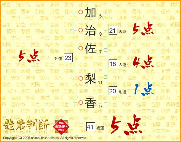 加(5画)治(9画)佐(7画) 梨(11画)香(9画)