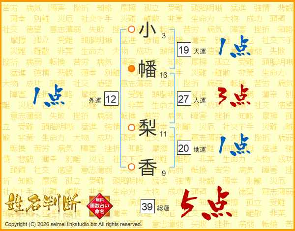 生活面を象徴する運勢です。外部から受ける影響力を表し、結婚運、家庭運や職場、環境への順応性を表します。総運から人運を引いた画数。姓や名が1文字の場合を除く。