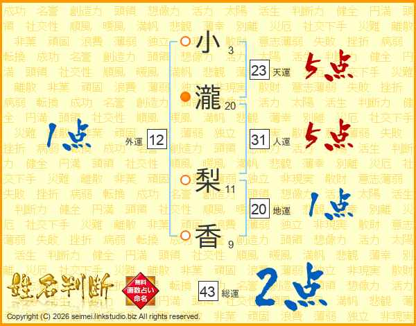 小(3画)瀧(20画) 梨(11画)香(9画)