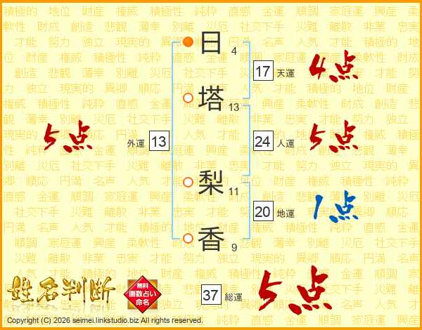 生活面を象徴する運勢です。外部から受ける影響力を表し、結婚運、家庭運や職場、環境への順応性を表します。総運から人運を引いた画数。姓や名が1文字の場合を除く。